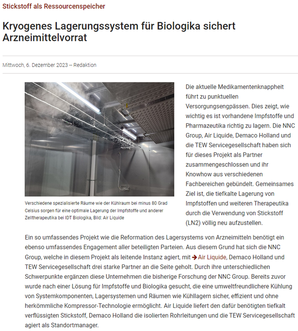 Current cold rooms are designed with an insulating wall so as to keep heat from penetrating into the interior for as long as possible. Advanced designs incorporate super vacuum insulation panels. NNC uses a different technique to optimize cooling -- a double-wall design incorporating two insulation panels of equal thickness that are separated by a plenum chamber. Cooling is effected with (LN2); the decompressed N2 then cools the plenum. This triple-layer separation of the internal environment from external temperatures results in a greatly extended warm-up time of the internal space and the stored products.