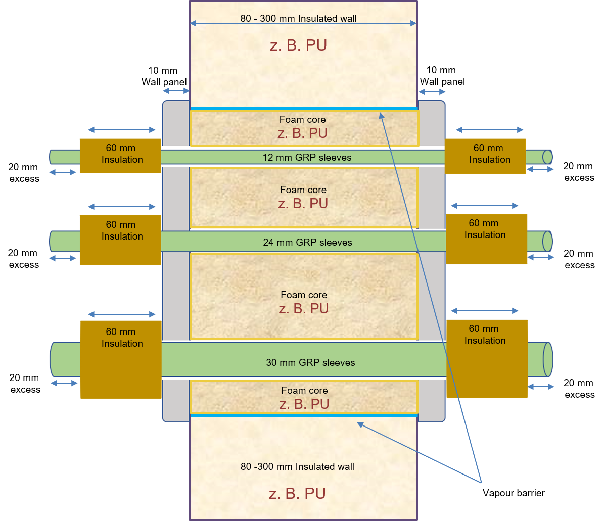 for pipes, electrical and data cables through insulated walls in cold rooms.